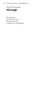 We’re flashing rare today, Reader, so here are two poems starting and stopping at exactly the right moments, Natalia Prusinska’s “Strange” and “Dry Orgasm”: