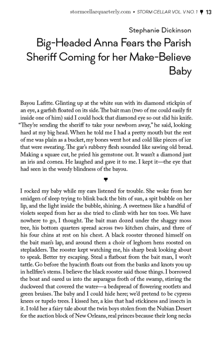 …And now a phantasmagoriad of flash creative nonfiction, one of which we nominated for a Pushcart last year, Stephanie Dickinson’s “Big-Headed Anna Making Soap” and “Big-Headed Anna Fears the Parish Sheriff Coming for Her Make-Believe Baby“: