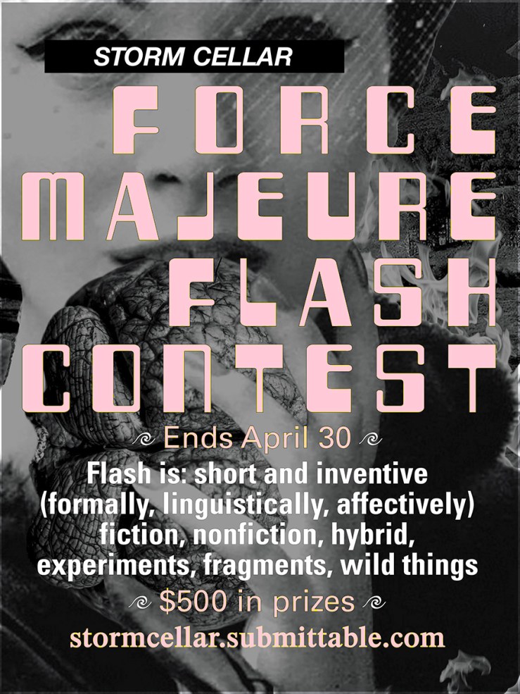 The 2020 FORCE MAJEURE FLASH CONTEST is open now! $500 in prizes for flash of any kind. Deadline April 30. Guidelines and enter: https://stormcellar.submittable.com/submit/72759/force-majeure-flash-contest