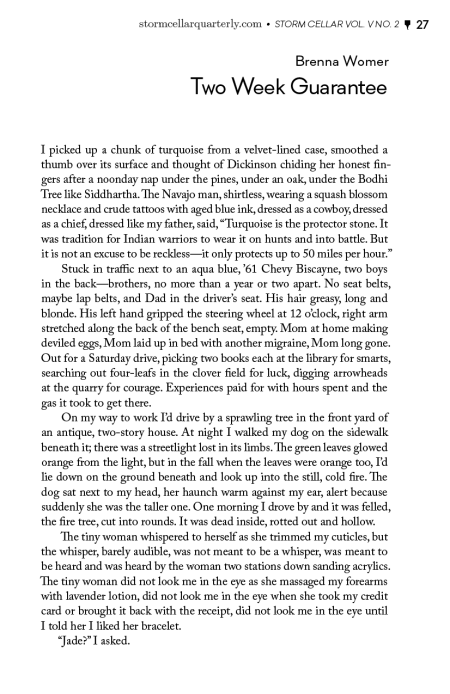 Today, dear Reader, we are chuffed to share Brenna Womer’s flash nonfiction “Two Week Guarantee“:
