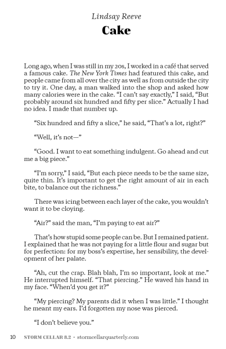 One thing about social distancing, we think, and just to make today’s share topical, though it need not be, it’s timeless, is, you have less of this tiny, moist interaction so carefully sliced and splayed upon the plate for our delectation: by Lindsay Reeve, here’s an honorable mention from our 2019 flash contest, “Cake.”