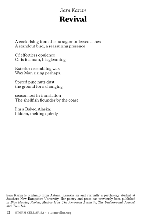 Today’s poem comes from Sara Karim, a dizzying feast on a small bed of imagery, “Revival“: