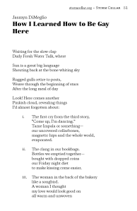 It’s your place, Reader, to find how your place is yours, how you are of and in this place for as long as you are of and in it, so take heart in Jasmyn DiMeglio’s “How I Learned to Be Gay Here“: